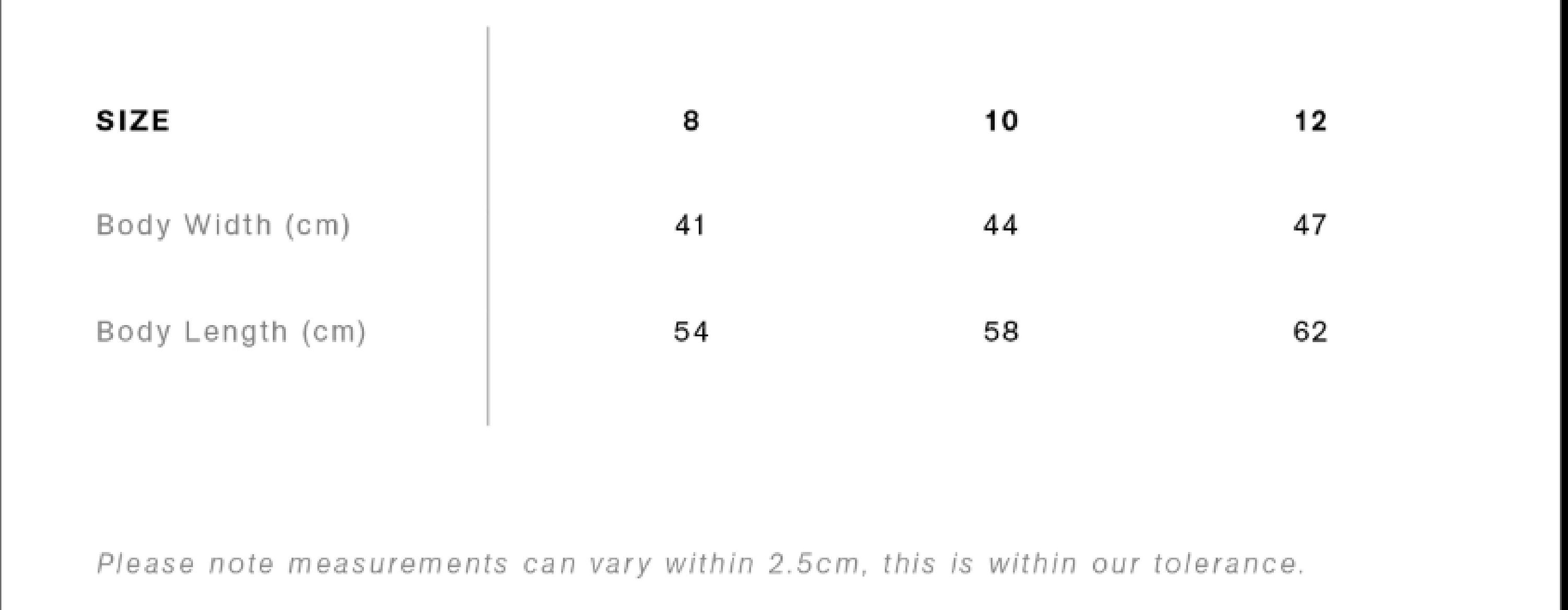 Given sizing can vary between brands, we recommend comparing the measurements in our size charts with a similar garment you already own and love. Please see size charts info here.